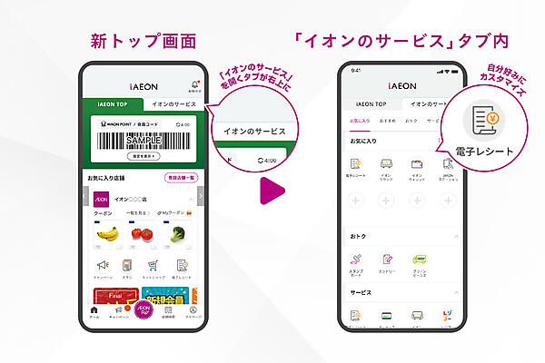 AEON Payボタンをスマートフォンを持った際に親指で操作しやすいフッター中央に新設。ワンアクションで決済画面へ進める。AEON Pay画面も視認性を高めた。トップ画面右上には「イオンのサービス」タブを新設して各種サービスにアクセスしやすくし、よく利用するサービスを選んで配置できるカスタマイズ機能も追加した。