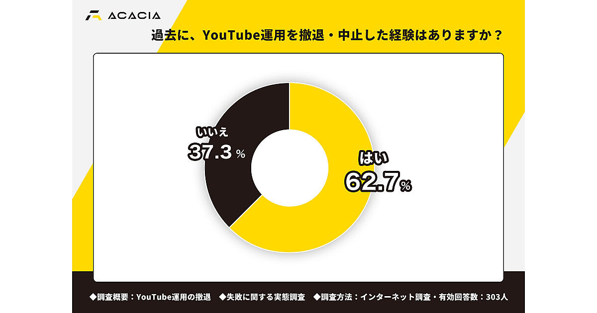 アカシアは、「YouTube運用の撤退・失敗に関する実態調査」を実施した。YouTubeを運用中、または運用した経験がある企業の担当者303名を対象に調べている。