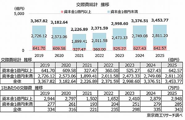 調査によると、2025年(2024年10月期~2025年9月期)の交際費総額は3,453億7,700万円となり、前期比2.2%増だった。4期連続で前期を上回り、コロナ禍前(2018年10月期~2019年9月期)の3,367億8,200万円を2年連続で上回っている。また、1社あたりの平均交際費は343万円となり、2024年の335万円から8万円増加した。