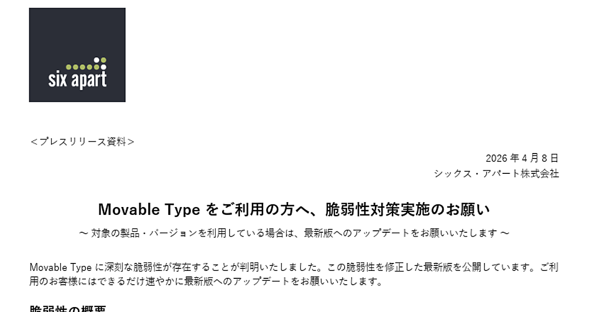 CMS(コンテンツ管理システム)と関連サービスのシックス・アパートは、CMSプラットフォーム「Movable Type」に深刻な脆弱性が判明したと4月8日に発表し、最新版へのアップデートを呼びかけている。直ちにアップデートが難しい場合の回避策として、Data APIのアクセス制限の設定も案内されている。