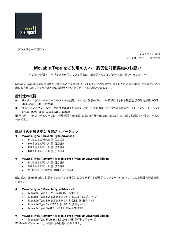 対策として同社は、脆弱性を修正した最新版への更新を求めている。提供する修正版は、「Movable Type」が9.1.1(クラウド版のみ)、9.0.7、8.8.3、8.0.10、「Movable Type Premium」が9.1.1(クラウド版のみ)、9.0.7、2.15。「Movable Typeクラウド版」はすべての環境で最新版へのアップデートが完了している。