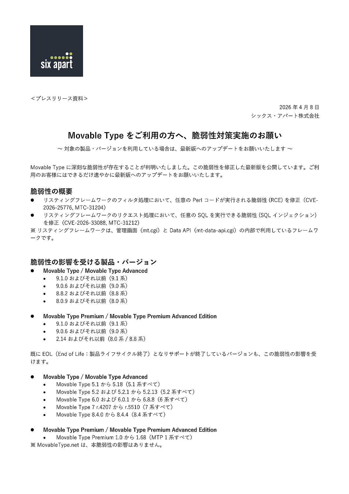 影響を受けるのは「Movable Type」「Movable Type Advanced」は9.1.0以前、9.0.6以前、8.8.2以前、8.0.9以前。「Movable Type Premium」「Movable Type Premium Advanced Edition」は9.1.0以前、9.0.6以前、2.14以前。EOL(製品ライフサイクル終了)バージョンも5系~8.4系で影響を受ける。「MovableType.net」は影響を受けない。