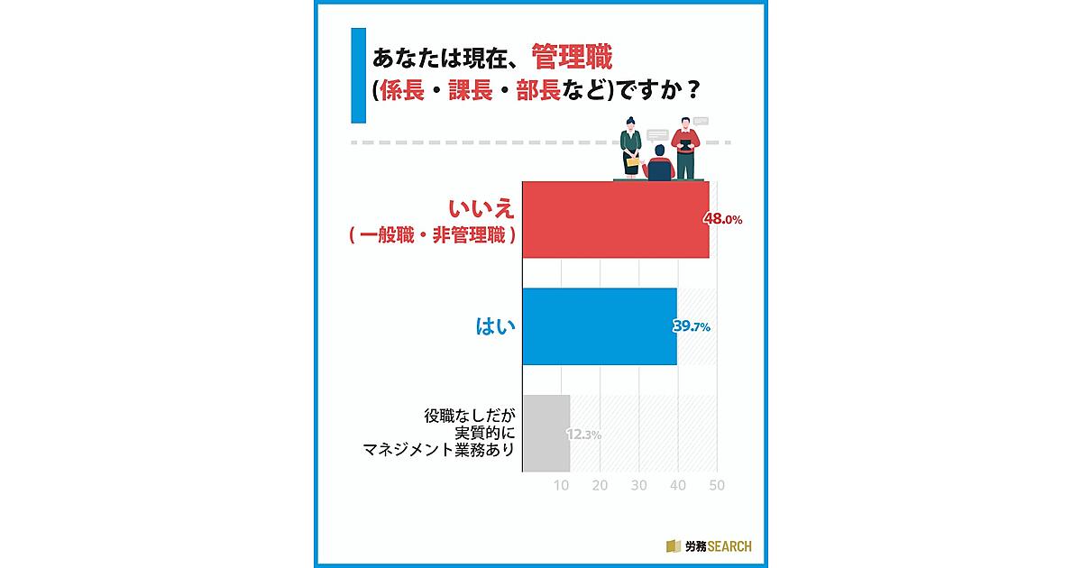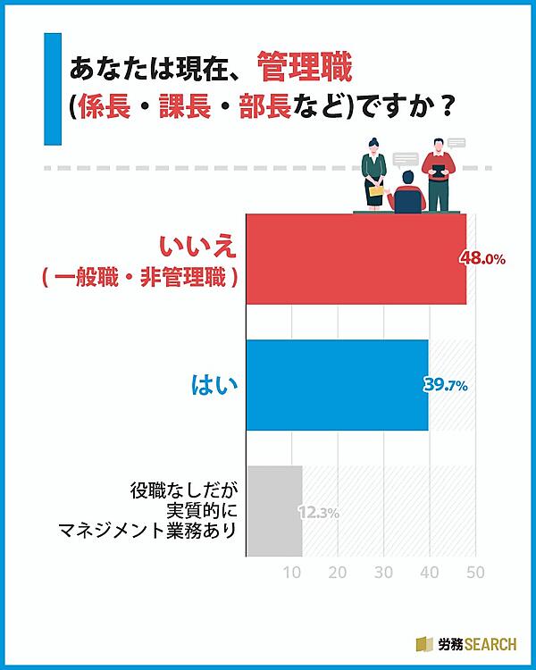 まず「あなたは現在、 管理職(係長・課長・部長など)ですか?」と聞くと「はい(管理職である)」39.7%、「役職なしだが実質的にマネジメント業務あり」12.3%で、過半数が何らかの形で管理・調整業務に従事していた。