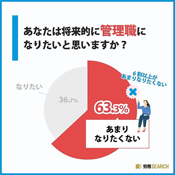 一方「将来的に管理職になりたいか」と聞くと、「あまりなりたくない」が63.3%に達し、「なりたい」の36.7%を大きく上回っている。