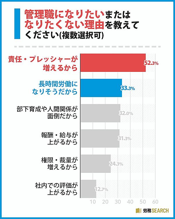 あわせて「管理職になりたい(またはなりたくない)理由」では、「責任・プレッシャーが増えるから」52.3%が最多。以下「長時間労働になりそうだから」33.3%、「部下育成や人間関係が面倒だから」32.0%が続き、すべて「報酬・給与が上がるから」31.3を上回る。