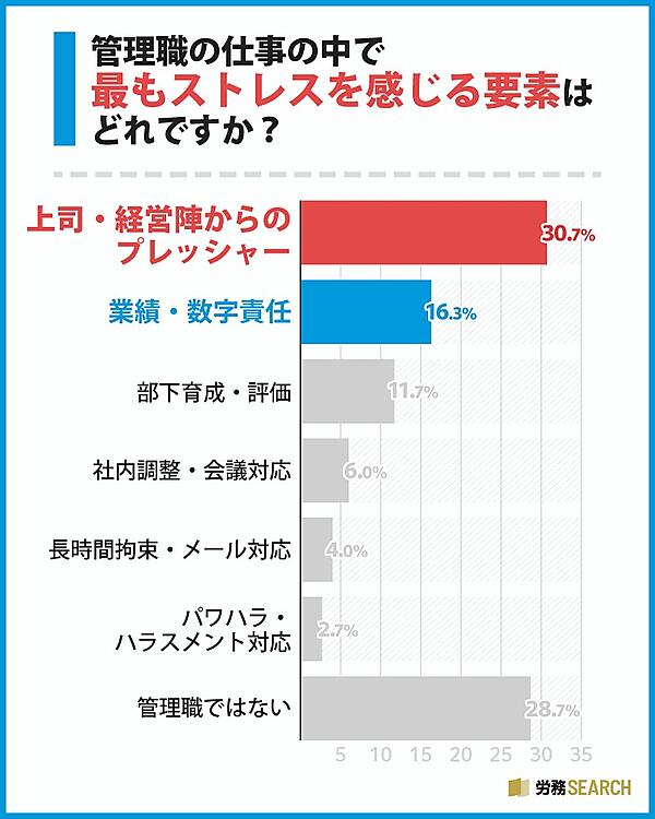 また「管理職の仕事の中でもっともストレスを感じる要素はどれですか?」については、「上司・経営陣からのプレッシャー」30.7%が最多で、以下「業績・数字責任」16.3%、「部下育成・評価」11.7%が続く。部下との関係よりも上層部との関係に強いストレスを感じている様子がうかがえる。