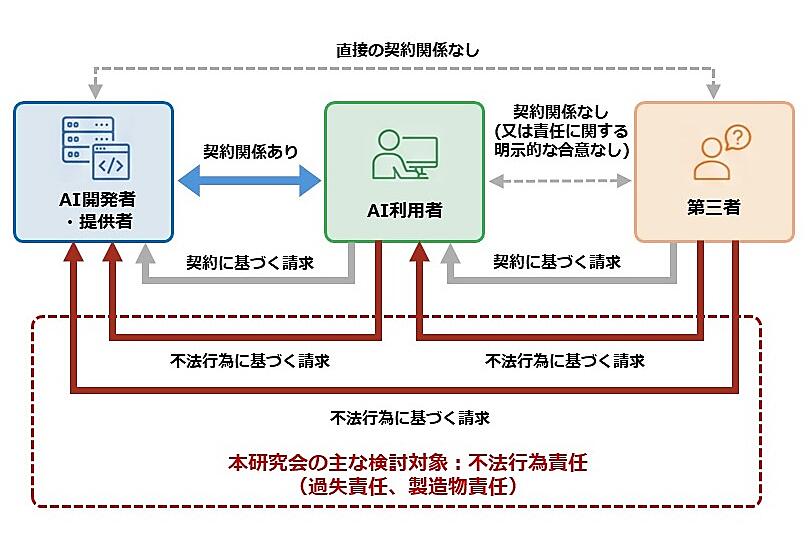 AI利活用で発生した損害の民事責任を考える裁判例の蓄積は十分になく、AI事業者にとってシステムの導入や開発をためらう一因となっている。このため経産省は、法学や技術分野の有識者で構成する「AI利活用における民事責任の在り方に関する研究会」(座長:大塚直・早稲田大学法学学術院教授)で議論して「手引き(案)」をまとめ、約1カ月間の意見公募を踏まえて修正し、公表した。