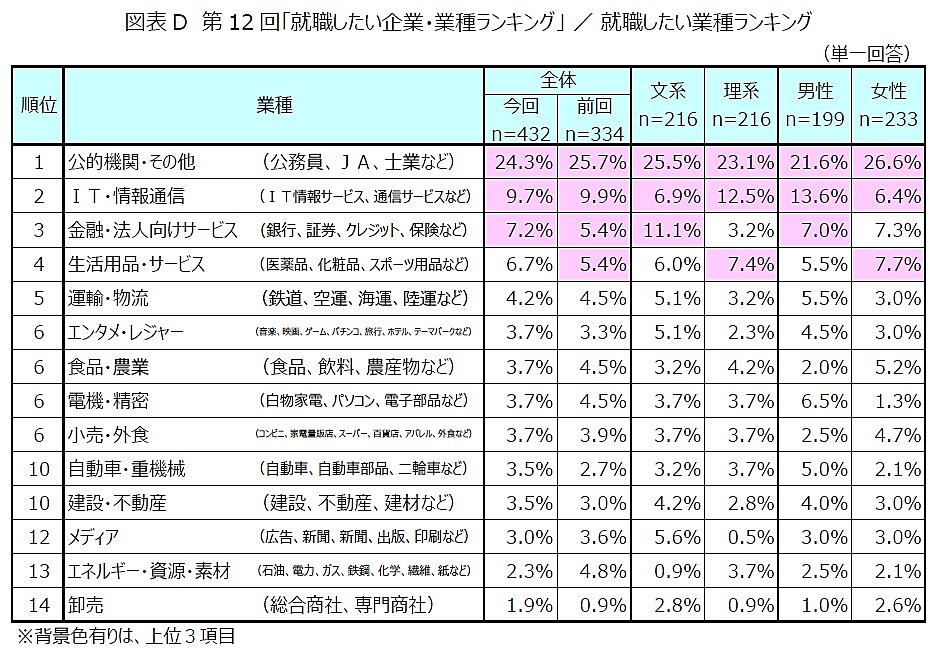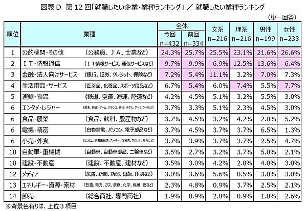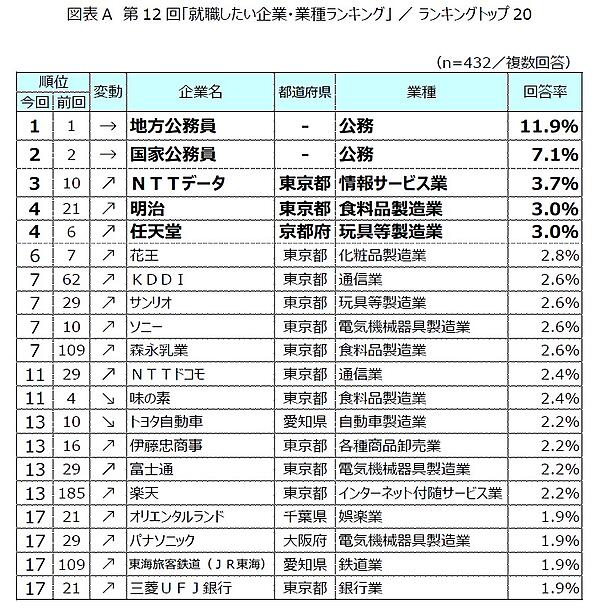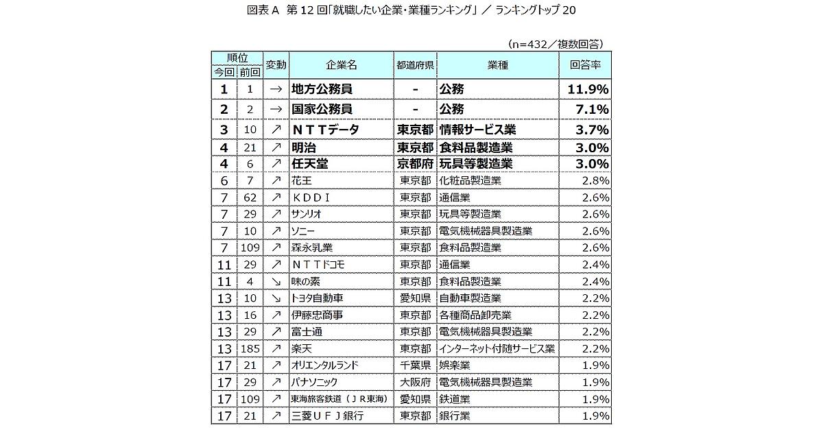 この調査によると、「就職したい企業・業種ランキング」のランキング1位は「地方公務員」回答率11.9%、2位は「国家公務員」7.1%でトップ2は変わらず。3位には前回10位の「NTTデータ」3.7%がランクインした。