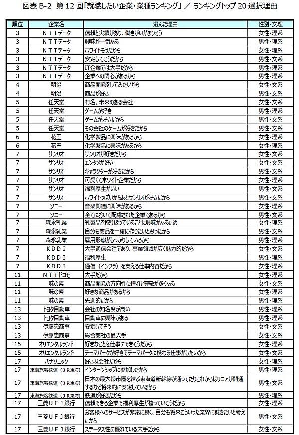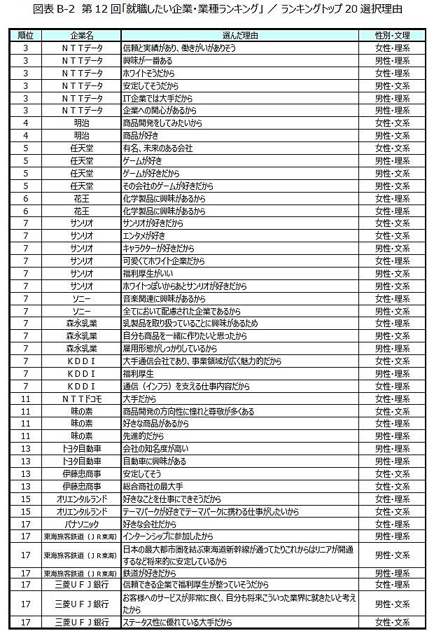 トップ20の業種をみると、食料品製造業(明治、森永乳業、味の素)、電気機械器具製造業(ソニー、富士通、パナソニック)が3社ランクインし最多となった他、公務(地方公務員、国家公務員)、玩具製造業(任天堂、サンリオ)、通信業(KDDI、NTTドコモ)に複数企業がランクインしている。一方第4回調査以降トップ20にランクインしていた「Google」がトップ20圏外となり、トップ20すべてを国内企業が占めた。