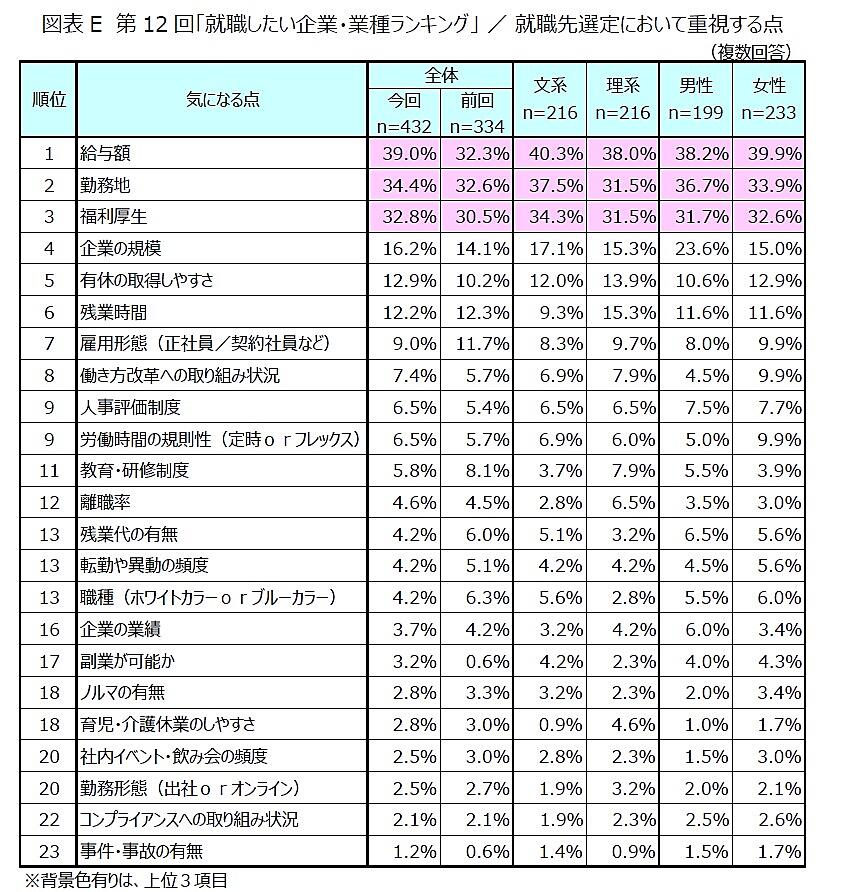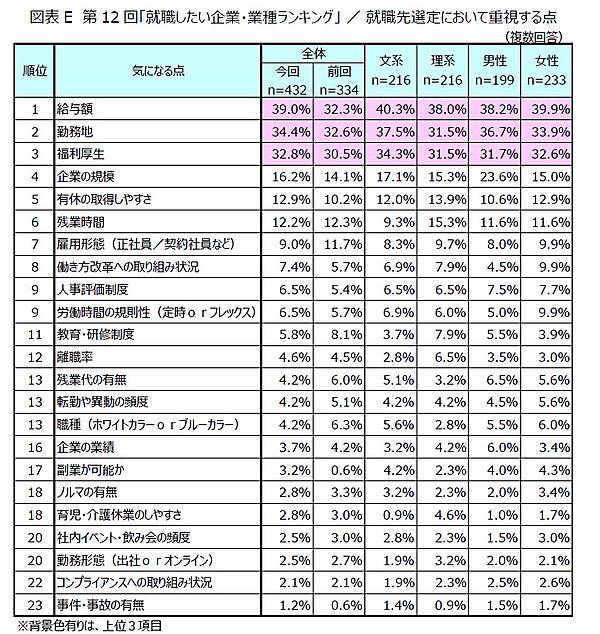 業種別で見ると、「公的機関・その他」24.3%、「IT・情報通信」同9.7%、「金融・法人向けサービス」7.2%が上位。就職先の選定において重視する点では、「給料額」39.0%、「勤務地」34.4%、「福利厚生」32.8%が上位だった。