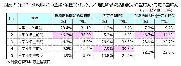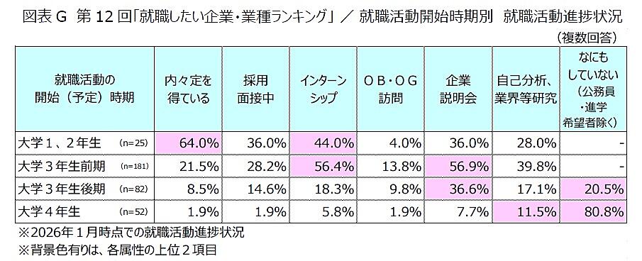 「理想/実際の就職活動開始時期」は、「大学3年生前期」(理想46.3%、実際46.7%)が最多。「就職活動開始時期ごとの就職活動進捗状況」では、「大学1、2年生」開始の6割以上、および「大学3年生前期」開始の約2割が「内々定を得ている」という結果だった。