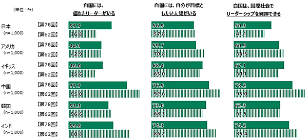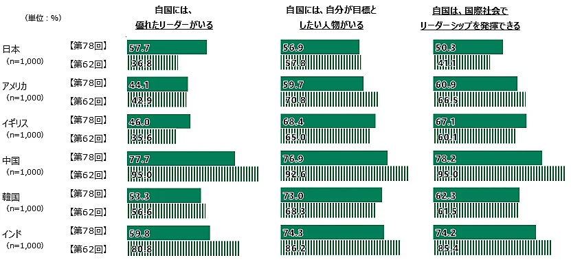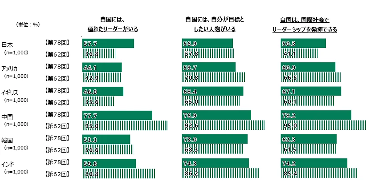 一方で、「自国には、優れたリーダーがいる」と答えた人の割合を見ると、日本では57.7%となり、前回の36.8%から約20ポイント上昇した。また、「自国は、国際社会でリーダーシップを発揮できる」も50.3%で、前回の41.1%からやや増加した。