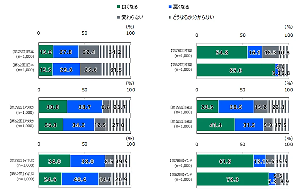 まず、自国の将来について「良くなる」と答えた割合は、インドが61.8%、中国が54.8%で過半数を超えた。他の4カ国と比べると高い水準にあるが、中国では前回調査から約30ポイント減少している。一方、日本は15.6%にとどまり、6カ国で最も低かった。前回調査の15.3%からは微増したものの、依然として将来への期待感は弱いことがうかがえる。