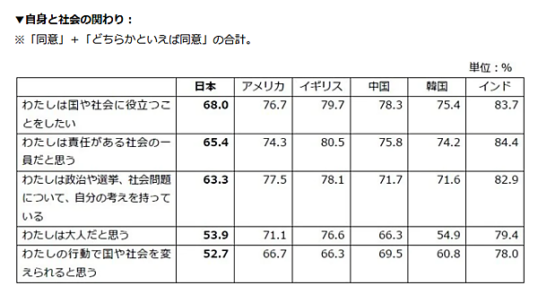 続いて、自身と社会の関わりについて聞くと、日本では「責任がある社会の一員だと思う」は65.4%、「政治や選挙、社会問題について、自分の考えを持っている」は63.3%、「わたしは大人だと思う」は53.9%となった。いずれも前回より微増したが、依然として6カ国比較では最も低かった。