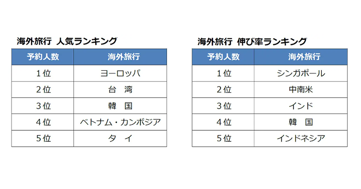 海外旅行の行き先ランキングでは、1位が「ヨーロッパ」、2位が「台湾」、3位が「韓国」となり、ヨーロッパではイタリアやスペインが上位となった。4位には「ベトナム・カンボジア」、5位には「タイ」が入っており、アジアの人気の高さもうかがえる。