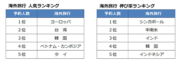 前年比の伸び率1位は「シンガポール」で、クルーズ客船で周辺を巡る「フライ&クルーズ」が人気を集めた。2位は8〜10日間の周遊ツアーが好評の「中南米」、3位は「インド」、4位は「韓国」、5位は「インドネシア」と続いている。出発日は4月29日、5月2日、5月3日に集中していた。