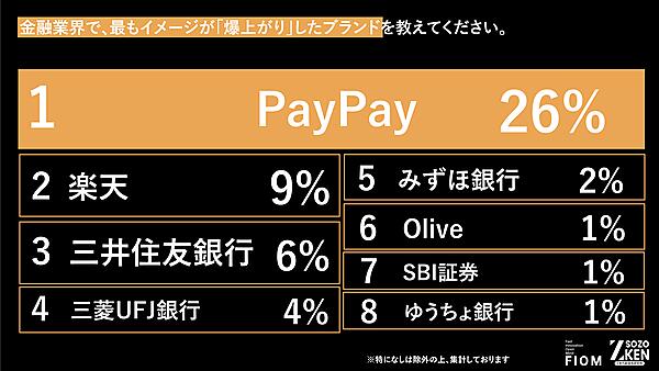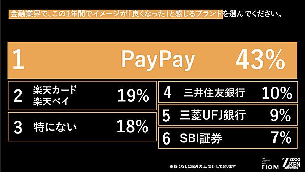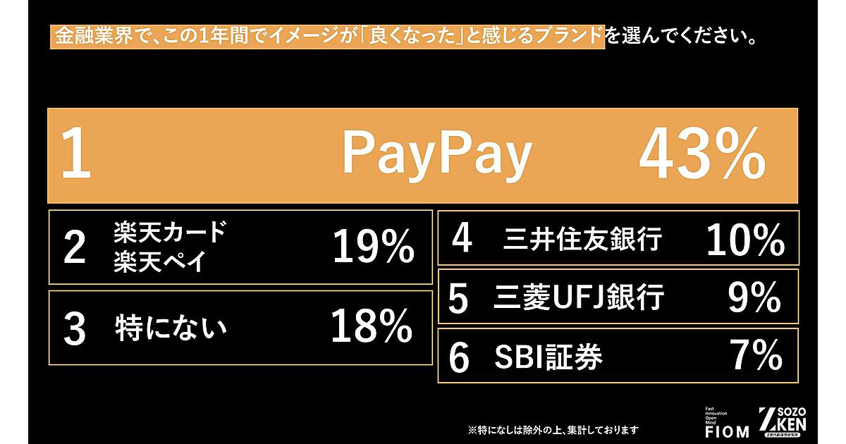 まず「この1年、金融業界でイメージが良くなったと思うブランド」を聞くと、「PayPay」43%が圧倒的多数。友達同士の「割り勘」「立て替え」なども可能な仕組みが“友達同士のコミュニケーションインフラ”として評価されたと推測される。