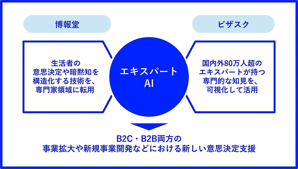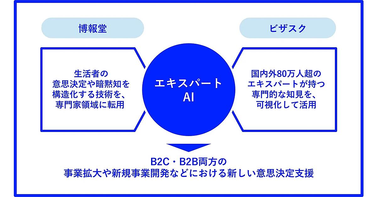 両社が開発するエキスパートAIは新規事業開発、市場参入、マーケティング戦略立案を行う企業の担当者向け。博報堂が保有する意思決定の思考構造化のノウハウ、AIエンジンと、ビザスクの専門家が持つ業界特有の常識や視点を融合。テーマを入力することで市場調査、競合分析、戦略立案の示唆出しまで自動で提供する。BtoC(一般消費者向け取引)だけでなくBtoB(企業間取引)にも対応する。