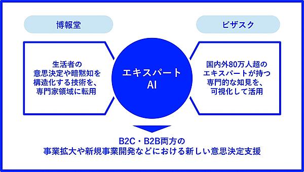 博報堂は、ナレッジ(知見・ノウハウ)プラットフォームを展開するビザスクと4月14日付で資本・業務提携契約を結んだ、と同日発表した。専門家の観点・判断軸・思考プロセスを学習したAIサービス「エキスパートAI」を共同開発する。専門家の知見とAIの分析を合わせ、企業の事業拡大、新規事業開発などでの意思決定を支援する。新サービス開発や顧客基盤を相互活用した販売連携も進める。