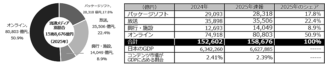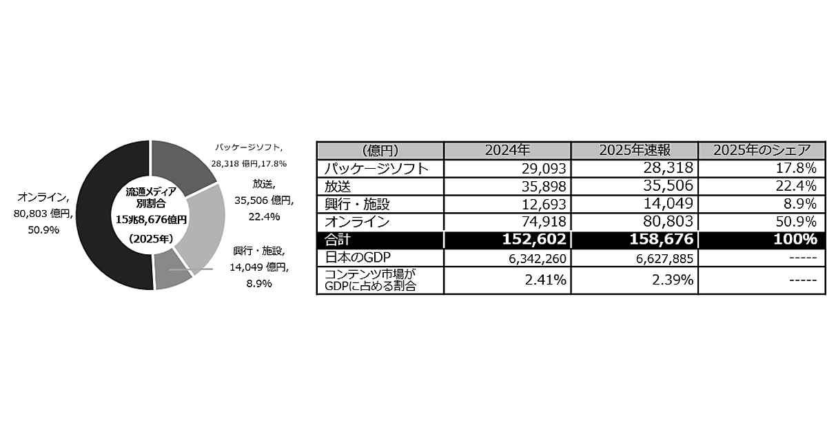 調査によると、2025年の日本の国内コンテンツ市場規模は15兆8,676億円となり、前年比約4.0%増で過去最大となった。