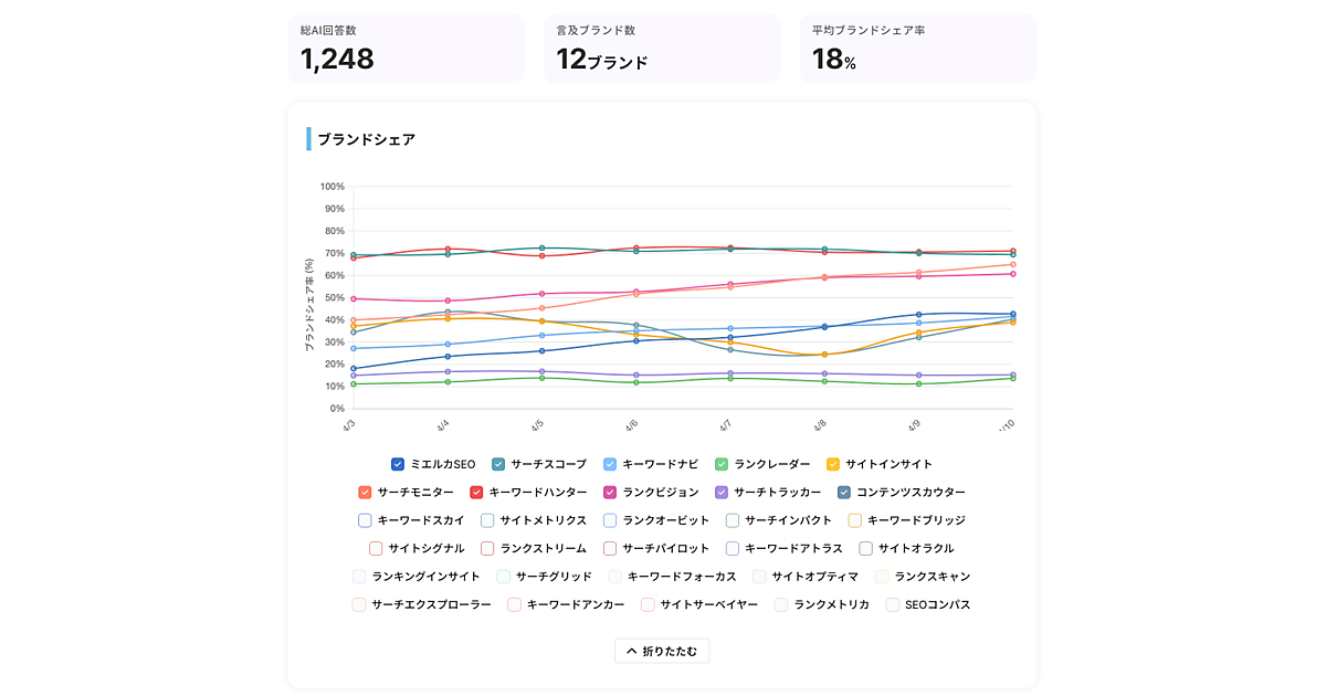 ウェブマーケティング支援事業のFaber Company(ファベルカンパニー)は、同社のSEO(検索エンジン最適化)プラットフォーム「ミエルカSEO」とGEO(生成AI最適化)プラットフォーム「ミエルカGEO」に、「AI検索シェアモニタリング機能」を搭載した、と4月15日発表した。AI検索での自社や競合ブランドの露出状況の定点観測が可能。AI検索の不透明な状況を可視化して戦略立案を支援する。