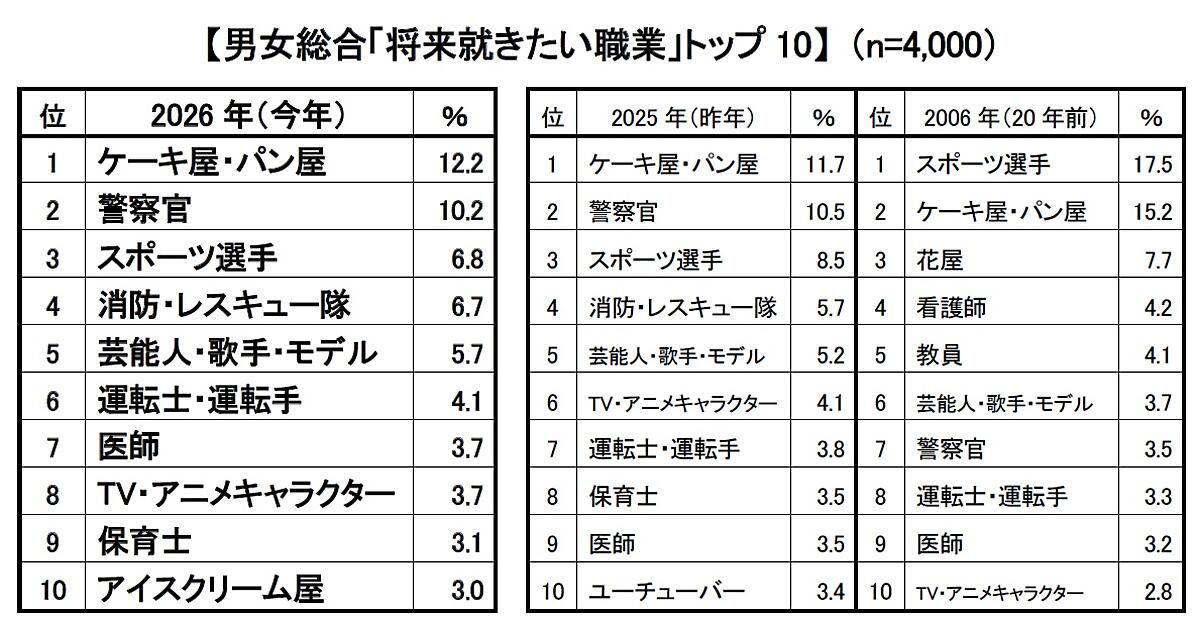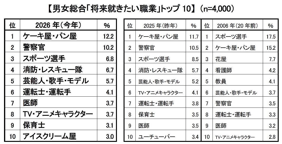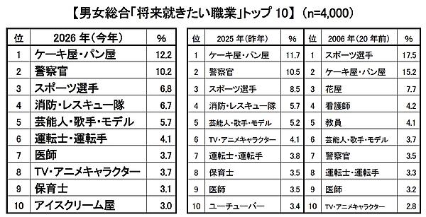 男女を合わせた総合順位は1位から5位まで前年と同じ。「ケーキ屋・パン屋」12.2%、「警察官」10.2%、「スポーツ選手」6.8%がトップ3だが、4位「消防・レスキュー隊」6.7%は、男女ともに支持を集めて過去最多となっている。また前年10位の「ユーチューバー」と入れ替わり「アイスクリーム屋」が初の10位となった。