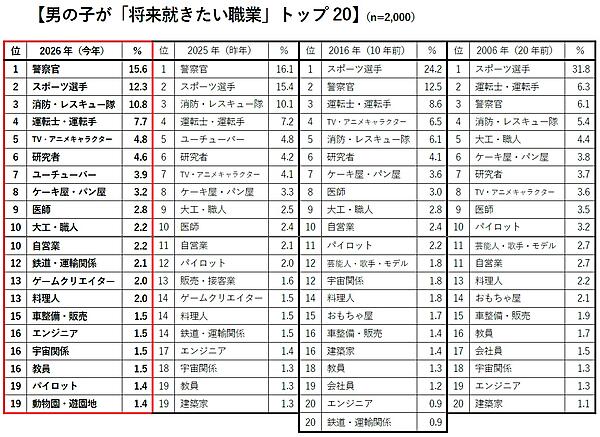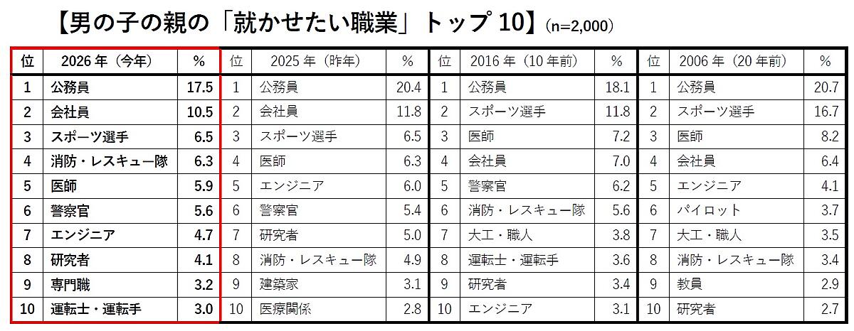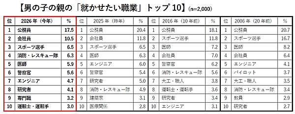 一方「親が男の子に将来就かせたい職業」は、「公務員」「会社員」が前年と同じ圧倒的多数。人気に連動して「消防・レスキュー隊」が過去最高タイの4位となったが、逆に5位「医師」5.9%は過去最少にまで減少した。