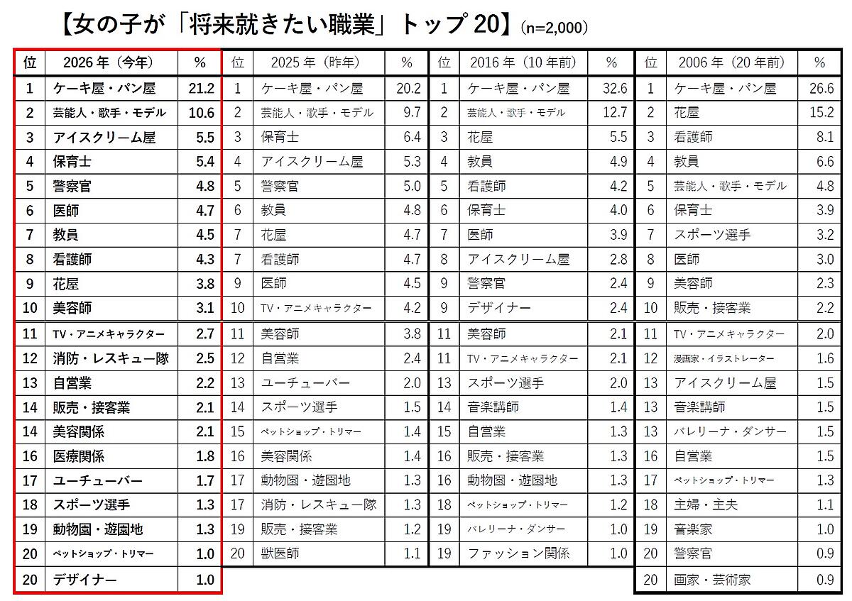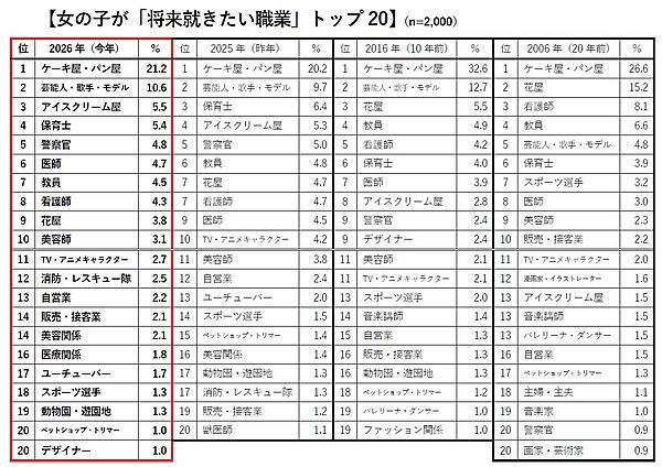 「女の子の将来就きたい職業」では、調査開始以来27年連続で「ケーキ屋・パン屋」が1位。2位「芸能人・歌手・モデル」、3位「保育士」がそれに続く。20年前は「ケーキ屋・パン屋」「花屋」が2強だったが、近年のアイドルブームによって2012年以降は「芸能人・歌手・モデル」が2位に定着。また「アイスクリーム屋」は初めて3位にランクインした。なお「消防・レスキュー隊」は前年からポイントが倍増し、過去最高の12位となった。20年前と比較すると、「漫画家・イラストレーター」「音楽講師」「バレリーナ・ダンサー」「音楽家」「画家・芸術家」といった芸術系の職業の多くが20位圏外となっている。