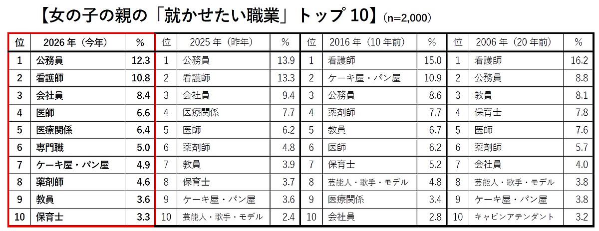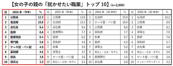 「親が女の子に将来就かせたい職業」も「公務員」が1位で、「看護師」が2位。順位に変動はないが、どちらもポイントが下がり、就かせたい職業の幅が広がっていると推察できる。またAIに代替されなさそうとの思惑からか「専門職」が過去最高の6位に入った。
