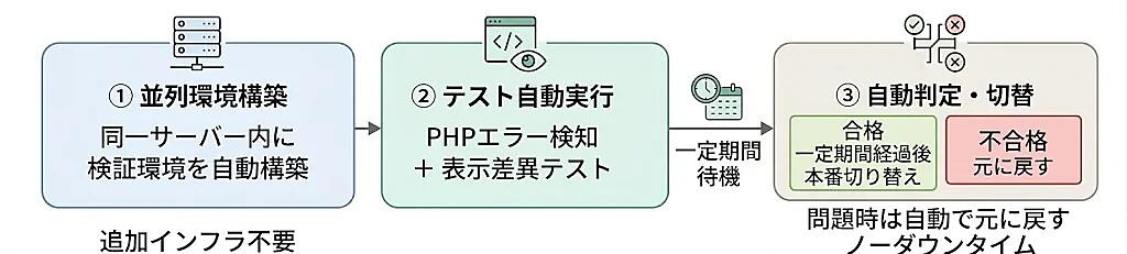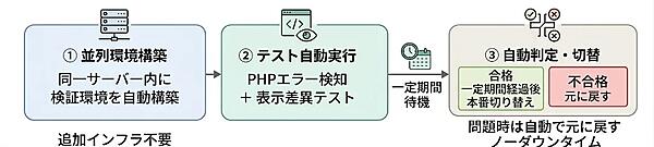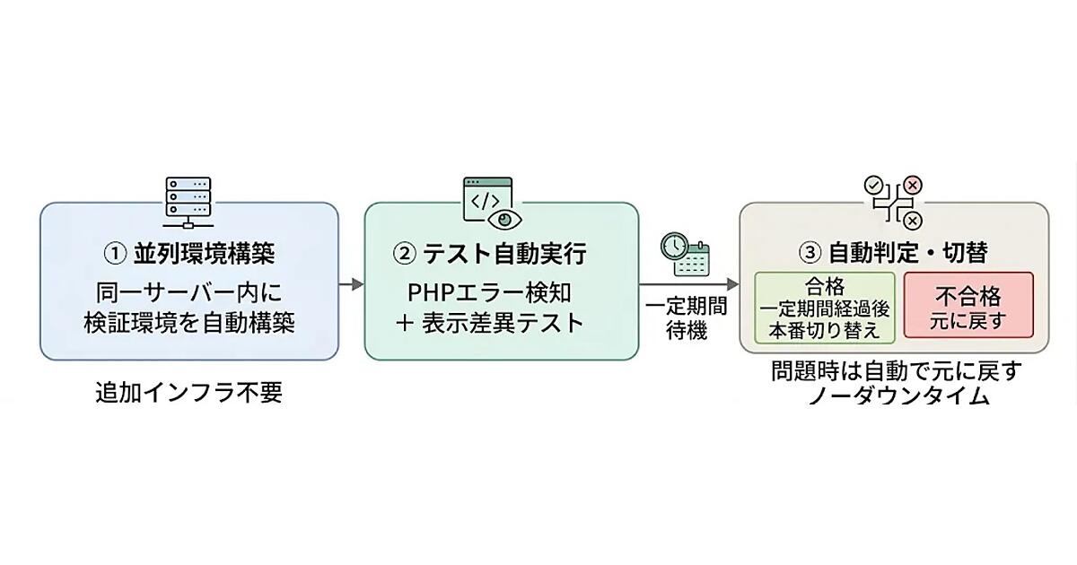 SafeUpgradeは、CMSの「WordPress」やPHPのバージョンアップを安全に自動で実行する技術。PHPはウェブページを動的に生成するサーバーサイドのプログラミング言語で、PHPの更新作業はこれまで、サービス停止が避けられなかった。SafeUpgradeの新版は、サービスを止めることなく同一サーバー内で完結し、検証環境の構築、エラーの検出、本番環境への切り替えまで自動化する。