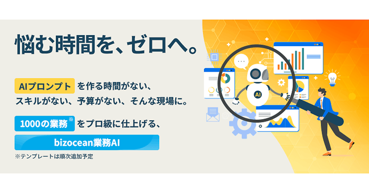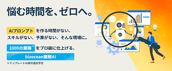 デジタルマーケティング支援・DXプラットフォーム事業のトライベックは、同社が展開するビジネス書式テンプレートサイト「bizocean(ビズオーシャン)書式テンプレ」で、新たなサービス「bizocean業務AI(β版)」と専用「AIプロンプトテンプレート(β版)」の提供を始めた、と4月15日発表した。AIへの指示(プロンプト)に悩まないようにして業務の時間、品質、スキルの不足を解消する。