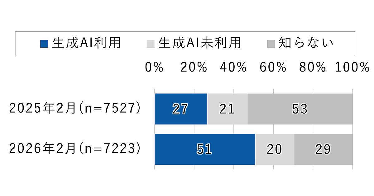 まず「生成AI利用率」を集計し、前年調査(2025年2月)と今回調査(2026年2月)の結果を比較すると、利用率は27%→51%へとほぼ倍増。ついに過半数を占めた。