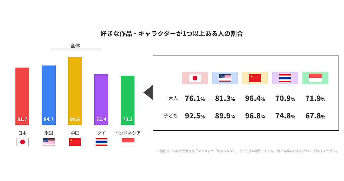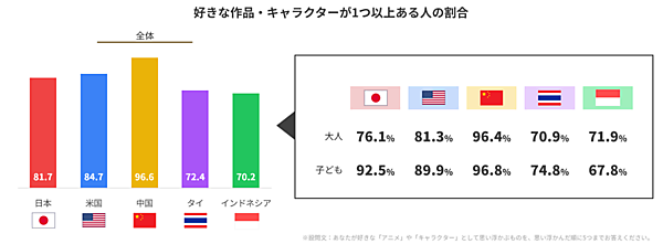 まず、好きな作品・キャラクターが1つ以上ある人の割合を見ると、中国が96.6%で最も高く、日本は81.7%、アメリカは84.7%、タイは72.4%、インドネシアは70.2%だった。大人と子どもを分けて見ても、中国はそれぞれ96.4%、96.8%と高水準で、幅広い世代に浸透していることがうかがえる。