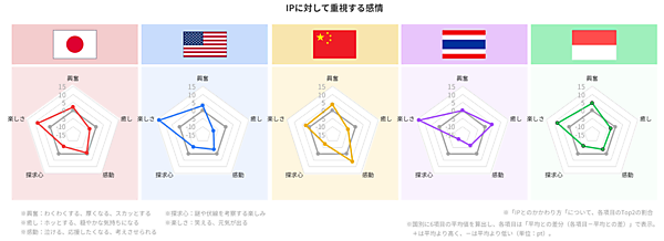 また、IPとの関わりを通じて得られる感情を聞くと、日本、アメリカ、インドネシアでは「楽しさ」が強く、中国では「感動」「興奮」、タイでは「楽しさ」「癒し」を求める傾向が見られた。