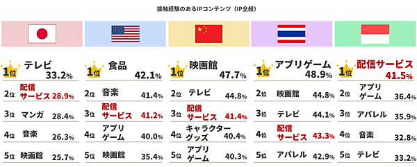 続いて、IPへの接触方法を聞くと、5市場すべてで「配信サービス」が上位5位以内に入った。一方で、最も接触経験率が高いチャネルは市場ごとに異なり、日本は「テレビ」が33.2%、アメリカは「食品」が42.1%、中国は「映画館」が47.7%、タイは「アプリゲーム」が48.9%、インドネシアは「配信サービス」が41.5%となった。