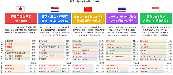 また、ある日本IPについて、今後どのような体験を期待しているかを聞くと、日本では「新作の物語」に加え、「テーマパーク」「設定解説」など、作品世界をより深く味わえる要素への関心が高かった。アメリカでは「ゲーム」「イベント」などが目立った一方で、中国では「コラボ商品」「テーマパーク」「二次創作イベント」など、参加型コンテンツの消費意向が比較的強い。また、タイでは「スピンオフ」「ファンコミュニティ」、インドネシアでは「新作の物語」「スピンオフ」「コラボ商品」に対する関心が高かった。