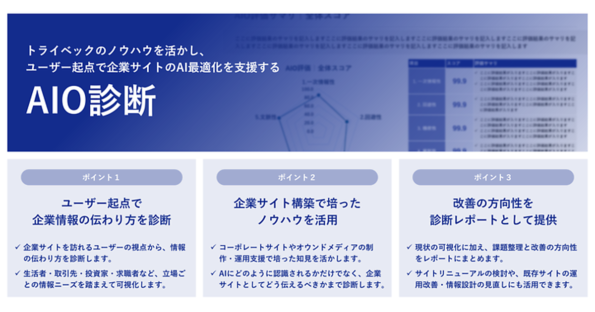 デジタルマーケティング支援・DXプラットフォーム事業のトライベックは4月20日、企業サイトのAI最適化(AIO)を支援する「AIO診断」の提供を開始したと発表した。企業サイトなどのオウンドメディアを対象に、生成AIやAI検索による企業情報の伝わり方を診断する。企業情報がどのようにAIに理解・整理・参照されうるかをユーザー起点で評価し、課題の可視化と改善の方向性を整理したレポートを提供する。