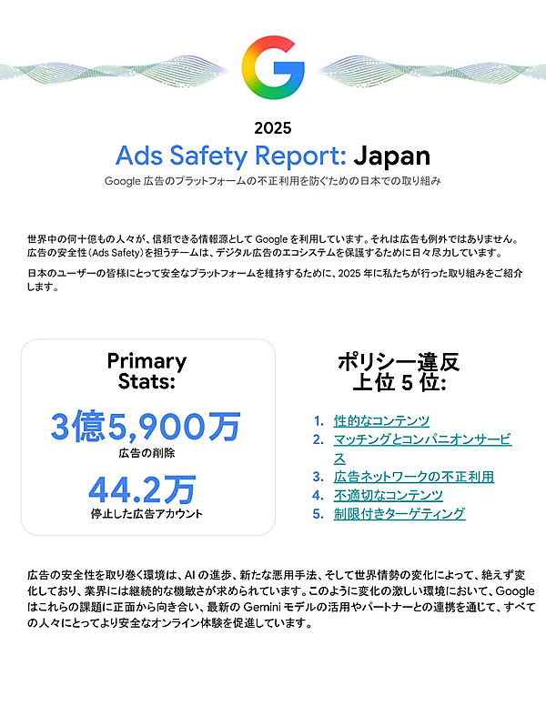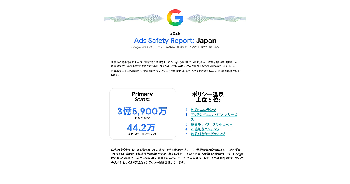 精度向上の恩恵は正規の広告主にも及ぶ。Geminiが信頼できる広告と悪意ある広告を高精度で識別できるようになり、正当な広告主に対する誤ったアカウント停止処分を2024年比で80%削減し、正規事業者が不当に広告配信を止められるリスクが大幅に低下した。なお日本のポリシー違反上位5位は、①性的なコンテンツ、②マッチングとコンパニオンサービス、③広告ネットワークの不正利用、④不適切なコンテンツ、⑤制限付きターゲティングだった。