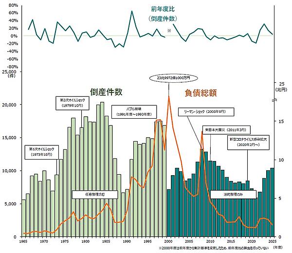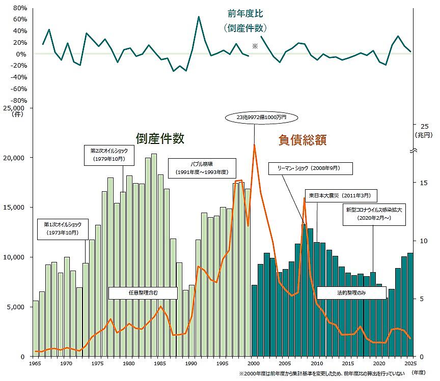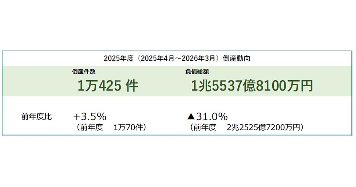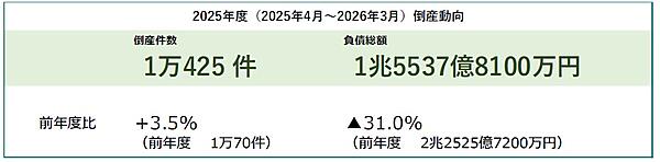 それによると2025年度の倒産件数は1万425件で、前年2024年度の1万70件から3.5%増となった。これで4年連続で2024年度を上回り、2年連続で年度1万件を超えた。