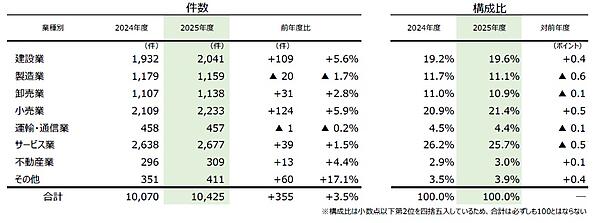 業種別に見ると、「サービス業」(2024年度2638件→2677件、1.5%増)がもっとも多く、「小売業」(同2109件→2233件、5.9%増)がそれに続く。これらはともに、2000年度以降で最多を更新している。業種別の特徴を細かくみると、「サービス業」では、医療スタッフの確保難や代表者の高齢化を背景に「医療」が増加。「小売業」は、物価高や人件費高騰の影響を受けたと推察される。