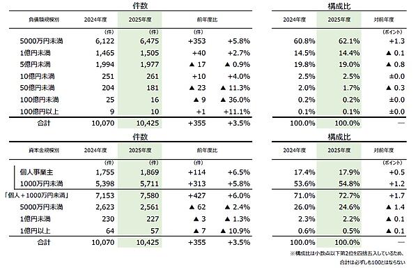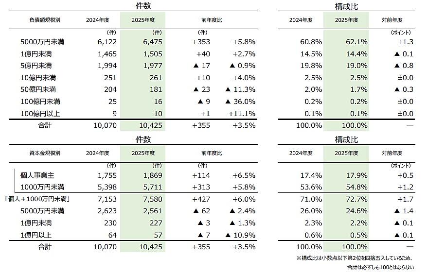 負債額を規模別に見ると、「5000万円未満」の倒産が6475件(2024年度6122件、5.8%増)で、2000年度以降で最多となり、全体の62.1%を占めた。資本金規模では、「個人+1000万円未満」の倒産が7580件(2024年度7153件、6.0%増)発生し、全体の72.7%を占めている。