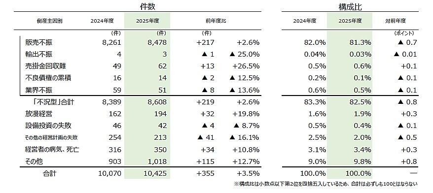 主因別では、「販売不振」が8478件(2024年度8261件、2.6%増)でもっとも多く、2年連続で8000件を上回った。「売掛金回収難」(2024年度49件→62件、26.5%増)や「業界不振」(同59件→51件、13.6%減)などを含めた「不況型倒産」の合計は8608件(同8389件、2.6%増)と、4年連続で2024年度を上回り、全体の82.5%(対2024年度0.8ポイント減)を占める。また「経営者の病気、死亡」(2024年度316件→350件、10.8%増)、「放漫経営」(同162件→194件、19.8%増)も増加傾向を見せている。