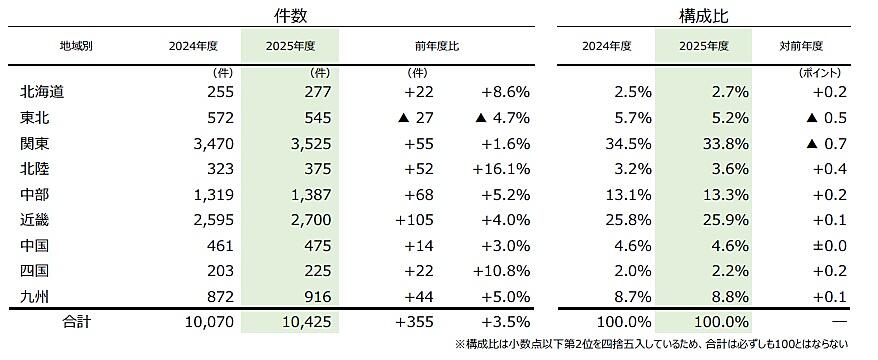 地域別に見ると、唯一「東北」(2024年度572件→545件、4.7%減)が前年を下回ったが、残る8地域は過去10年で最多となった。「関東」(同3470件→3525件、1.6%増)は、4年連続で2024年度を上回り、全体の33.8%を占めた。