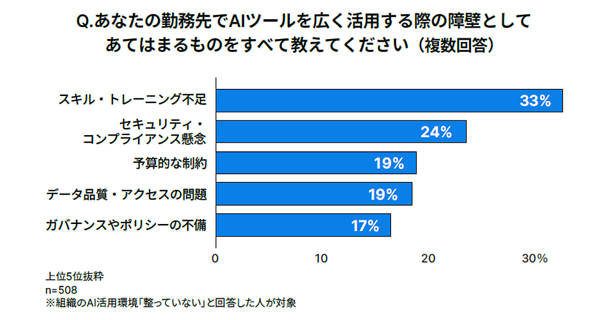 AI活用を妨げる要因としては、「スキル・トレーニング不足」が33%で最も多く、「セキュリティ・コンプライアンス懸念」が24%、「予算的な制約」と「データ品質・アクセスの問題」が19%と続いた。