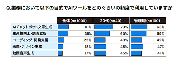 活用目的別に見ると、週に1回以上の利用者では、「文章生成・チャットボット」(41%)が最も多く、次いで「生産性向上・調査支援」(38%)、「コーディング・開発支援」(23%)と続いた。また、世代別・役職別では、20代と管理職が特にAI活用率が高い傾向が見られた。
