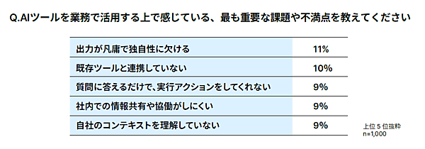 AIツールを活用する上での課題や不満点としては、「出力が凡庸で独自性に欠ける」「既存ツールと連携していない」などが多く、より自社の実務に沿った提案が期待されていることがわかった。