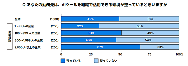 続いて、所属している組織のAI活用環境について聞くと、全体では「整っている」が49%、「整っていない」が51%と半々だった。また、従業員数2,000人以上の大規模企業では67%が「整っている」と回答した一方で、1~99人の小規模企業では32%にとどまっており、2倍以上の差が見られた。