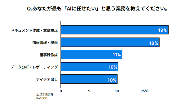 AIに任せたい業務を聞くと、「ドキュメント作成・文章校正」が19%で最多となり、次いで「情報管理・検索」が18%、「議事録作成」が11%となった。日常的に時間がかかっているナレッジワークをAIで効率化したいと考える人が多いようだ。