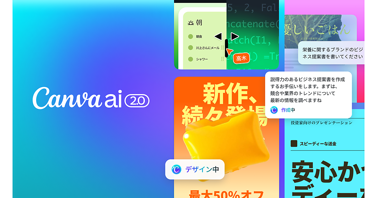 オンラインデザインプラットフォーム「Canva(キャンバ)」を展開する豪州Canvaは、「Canva AI 2.0」をリサーチプレビュー版として公開したと4月16日(現地時間)に発表した。月間2億5000万人超のユーザーが利用するプラットフォームが、AIエージェントを活用した会話形式のデザインツールに生まれ変わる。Canvaサービスを開始した2013年以来で最大のアップデートで、アイデアの入力から完成・公開の全工程を1つのプラットフォームで完結する。