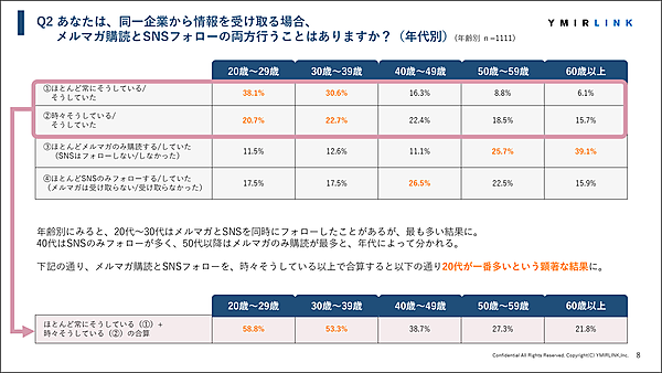 メッセージングソリューション事業で「Cuenote(キューノート)」を提供しているユミルリンクは4月22日、調査レポート「メルマガ登録・SNSフォローや購買のきっかけにおける実態調査 ~2026年版~」を公開した。調査結果によると、約半数(49.3%)の消費者が「同一企業のメルマガ購読とSNSフォローの両方を行うことがある」と回答した。特に20代・30代でこの傾向が強く、若年層ではメルマガとSNSの併用が主流であることが明らかになった。